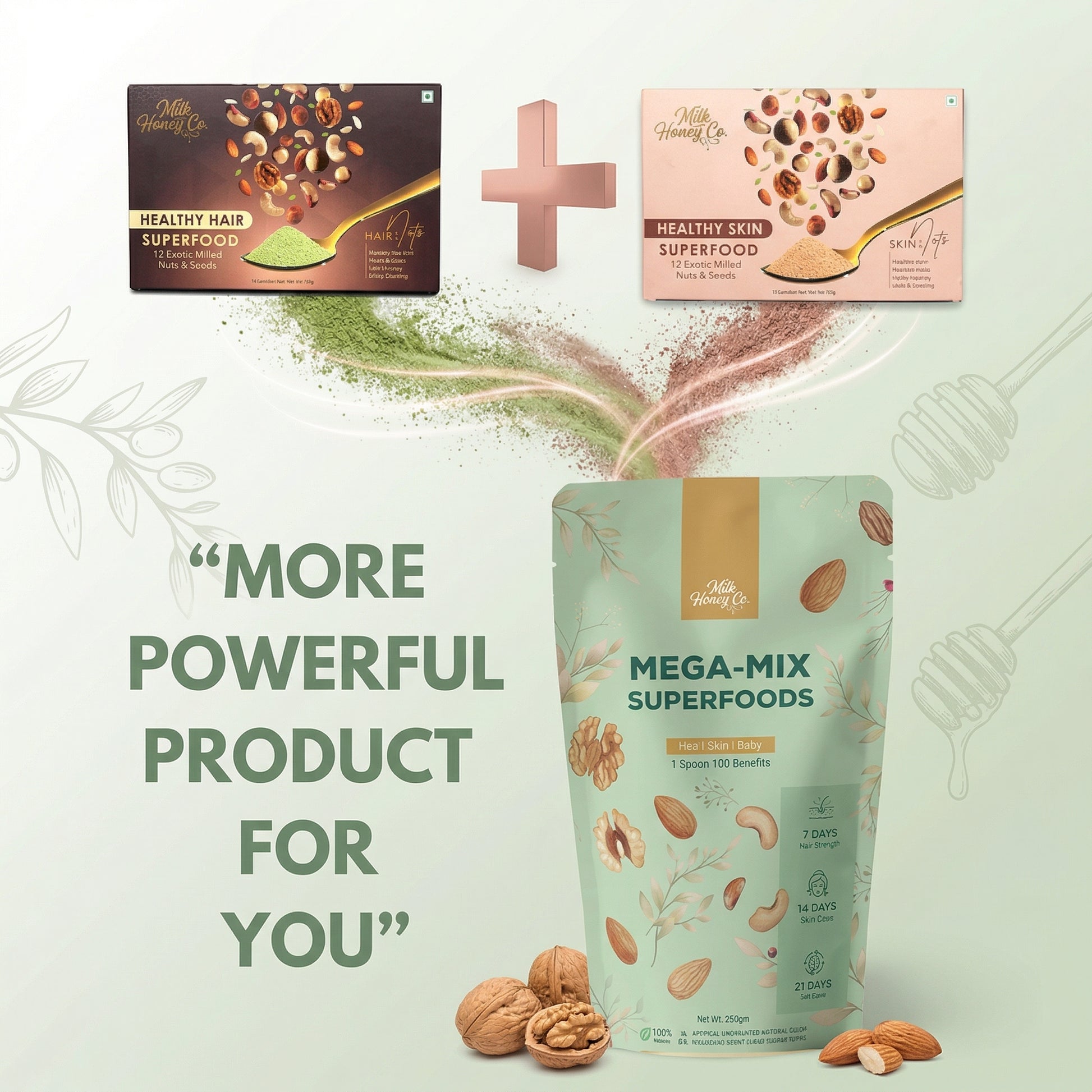 Mega-Mix Superfood is a nutrient-rich blend of premium nuts and seeds designed to support daily wellness, hair health, and glowing skin. It provides natural vitamins, minerals, and antioxidants for overall nourishment.